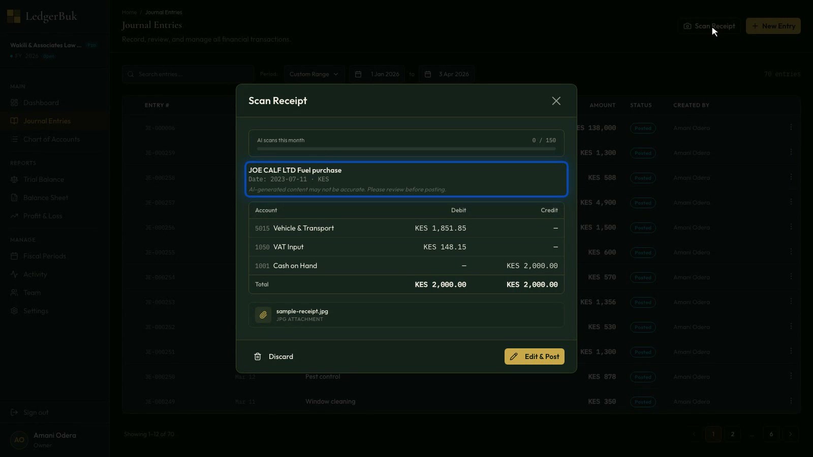Upload a receipt and let AI extract line items, detect VAT, and create the entry