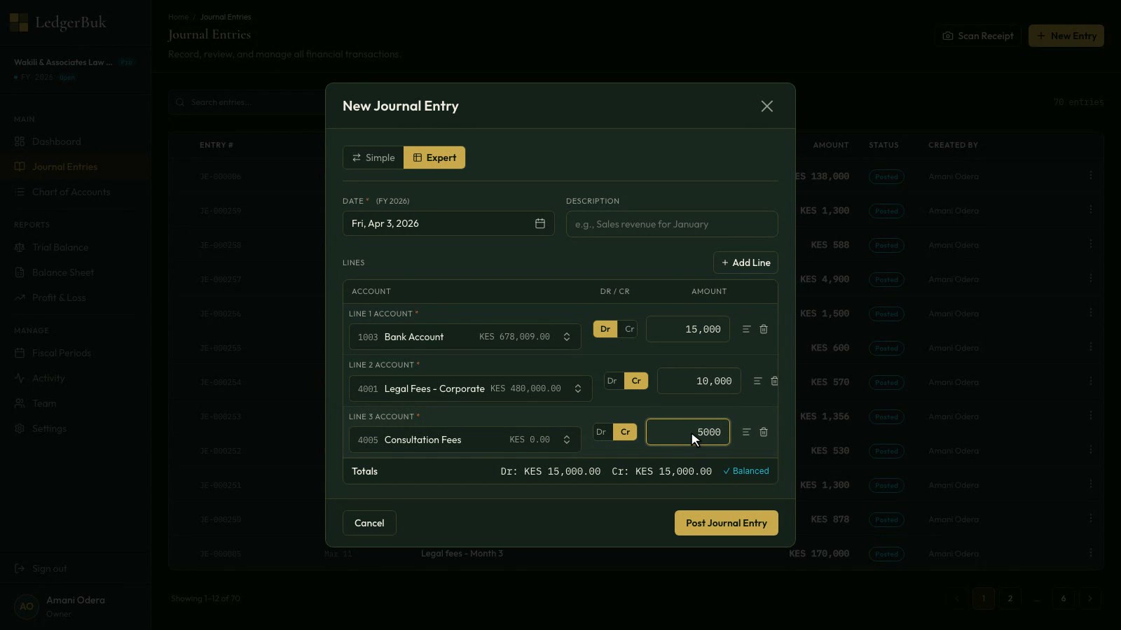 Create a multi-line journal entry with debits and credits in expert mode